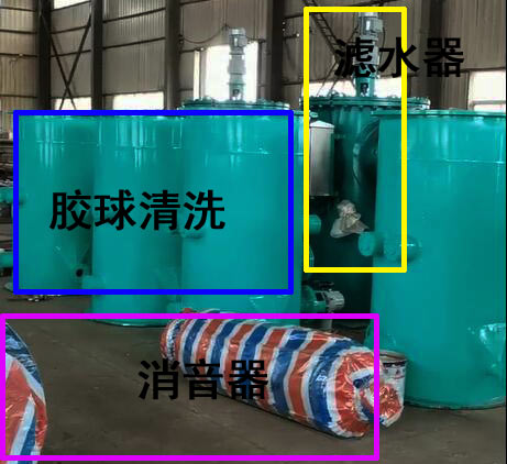 3、裝球室:裝球室是膠球清洗裝置中用于放球、取球、存儲和觀察膠球循環情況的裝置:它由外殼、漏斗、切換閥等部件組成,并配有觀察窗、放氣閥、放水閥。ZQS型裝球室(膠球存儲器)